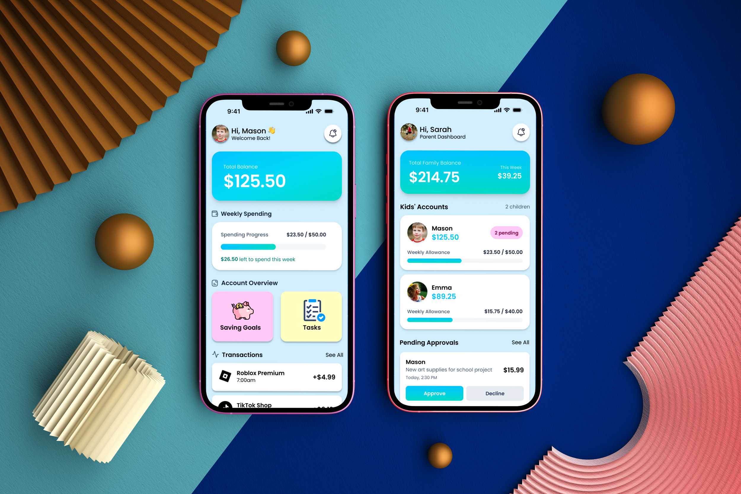 Parents get a dashboard to monitor balances, allowances, and requests.